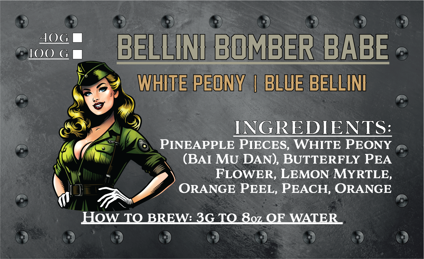 Strap in and prepare for takeoff into flavor paradise with Bellini Bomber Babe, a bold and vibrant fruit-forward white tea blend that’s as dazzling as a pin-up girl on the nose of a WWII bomber. Infused with juicy peach, citrus zest, and the mesmerizing blue hue of butterfly pea flower, this tea is as smooth as it is striking. Whether served hot or iced, it’s a mission-ready sip that’ll leave you floating on cloud nine.